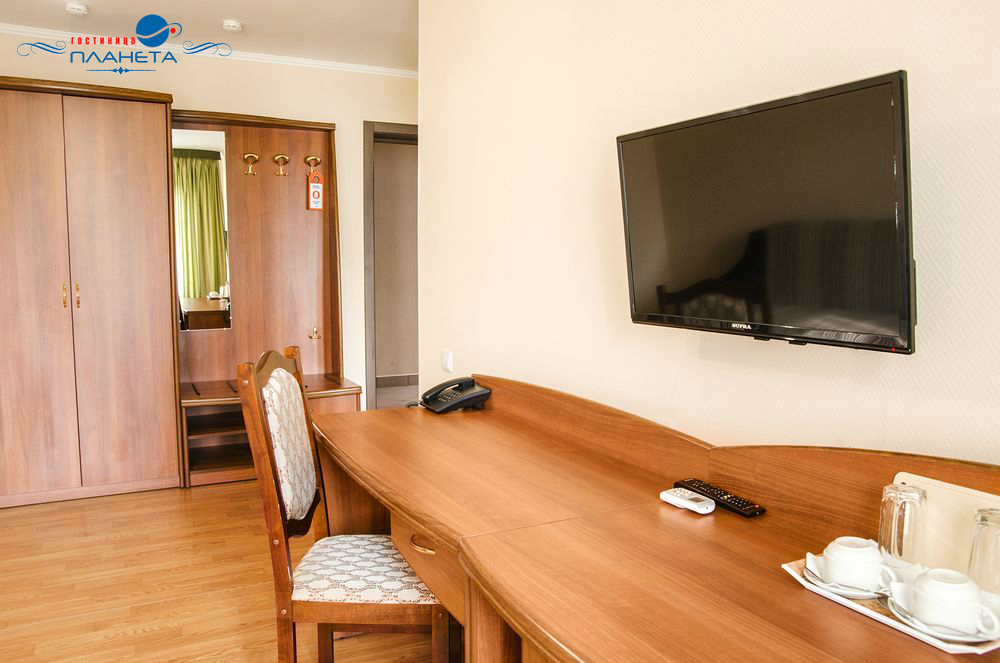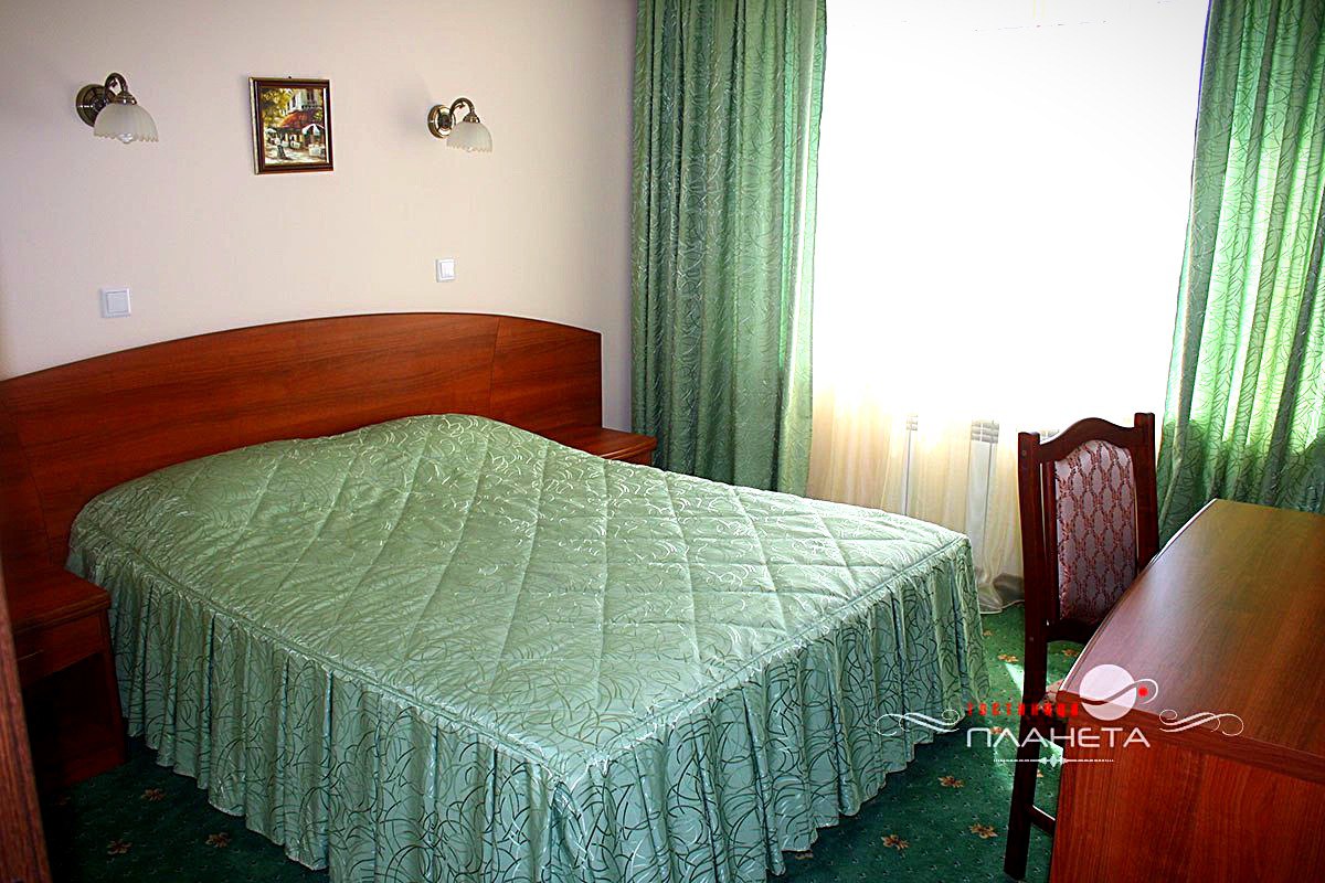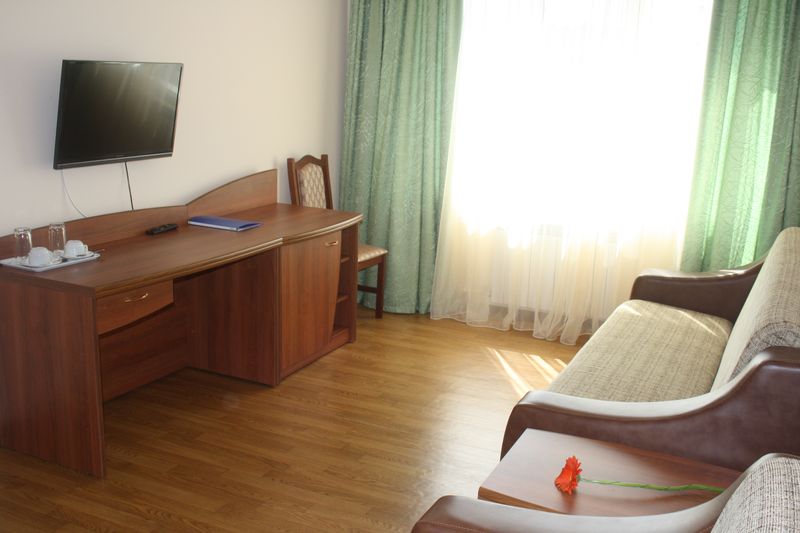 В номере: Одна кровать 160*200 или 2 отдельно стоящие 90*200, тумбочки, стол, стул, зеркало, диван, кресло, журнальный стол, стул, кондиционер, телевизор, фен, холодильник, чайные пары, графин, стаканы, шкаф, вешалка с багажной полкой и зеркалом, набор полотенец (3 шт. на гостя), комплект постельного белья, дополнительные одеяло и подушка, халаты, тапочки, мыло, шампунь, швейный набор, гель для душа, фонарик, ключ для открывания бутылок , рожок для обуви, губка для обуви, гигиенический пакет, пакет для прачечной, корзина для бумаг.