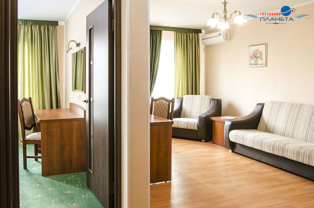Современный двухкомнатный номер I-категории , состоящий из двух комнат (спальня, гостиная). Общая площадь номера 32.4м2. Отличается от номеров остальных категорий более высоким качеством отделки, текстиля и декора.
